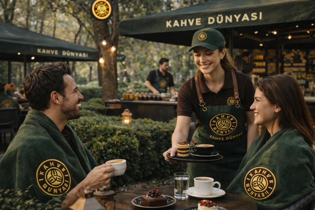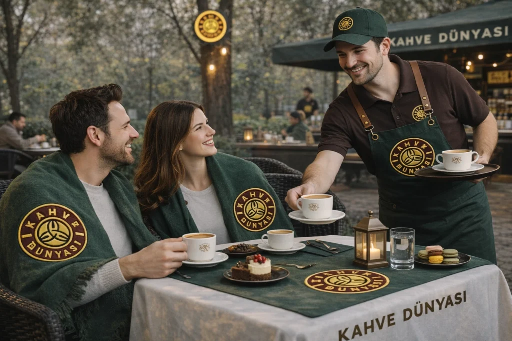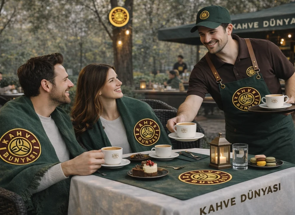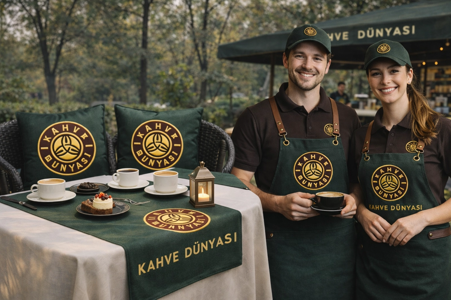 The Kahve Dünyası Çatalca textile concept successfully integrates branded tablecloths, custom runners, decorative cushions, customer shawls, and staff uniforms into a unified hospitality identity.
